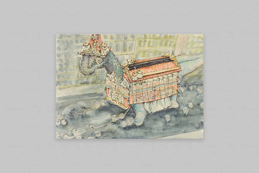 祇園祭の前祭巡行を、今年の7月に初めて観覧しました。感動したのは、想像以上に大きくて美しい山鉾です。千年以上前から続く祇園祭の中で、ゆっくりと、でも力強く道を進んで行く山鉾はまるで恐竜のようだと感じて、この作品を制作しました。描写において長刀鉾と草食恐竜のブラキオサウルスを参考にしています。恐竜鉾の迫力と美しさを感じていただけたら幸いです。