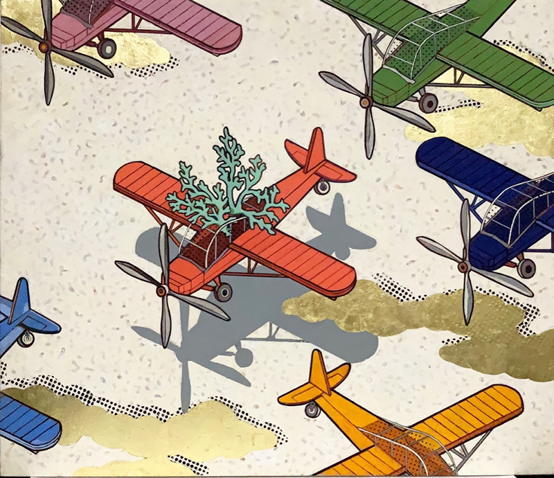 ポップな表現と、日本の伝統的な意匠を融合して、飛行機のモチーフを描いている。 アフォーダンスは脳科学分野で知覚の始まりという意味。機械の飛行機に植物が生える=意志の芽生えを表現している。