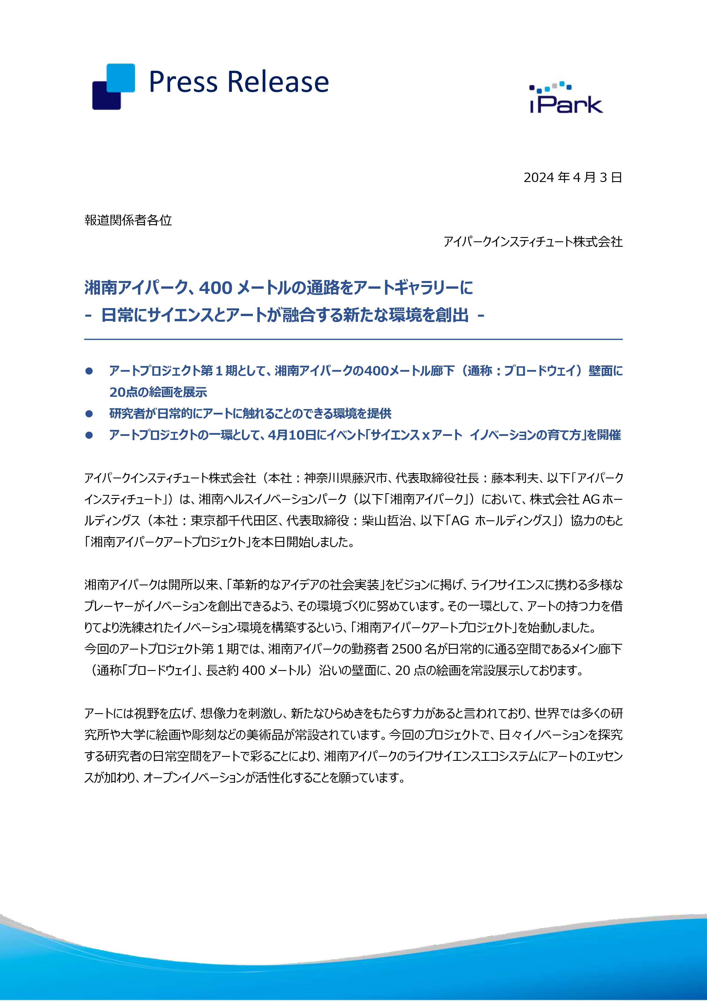 【Press Release】湘南アイパーク、400メートルの通路をアートギャラリーに – 日常にサイエンスとアートが融合する新たな環境を創出 –